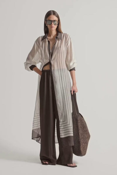 The Havana Maxi Dress is made of a lightweight semi-sheer fabric with a soft, silky texture ideal for summer. A classic shirt silhouette with button through front and collared neck, this dress includes a removable slip and string belt. Style open over a wide leg pant for a unique work to weekend look.